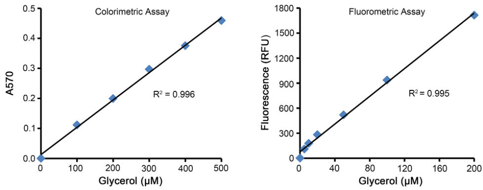 Figure 2. The standard curve for glycerol detection using the Glycerol Assay Kit (ARG-100T). The left image shows absorbance detection, and the right image shows fluorescence detection. The detection data in the figure shows a 60 minute reaction at 37ºC in the dark, and the value may be slightly lower after 30 minutes of reaction. The measured data may vary due to differences in experimental conditions, testing instruments, etc. The data in the figure is for reference only.